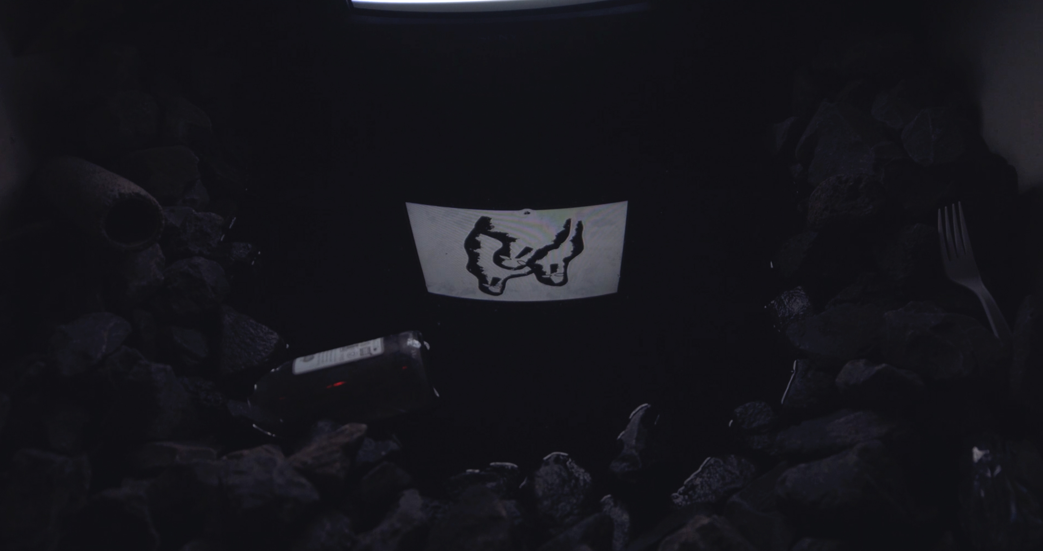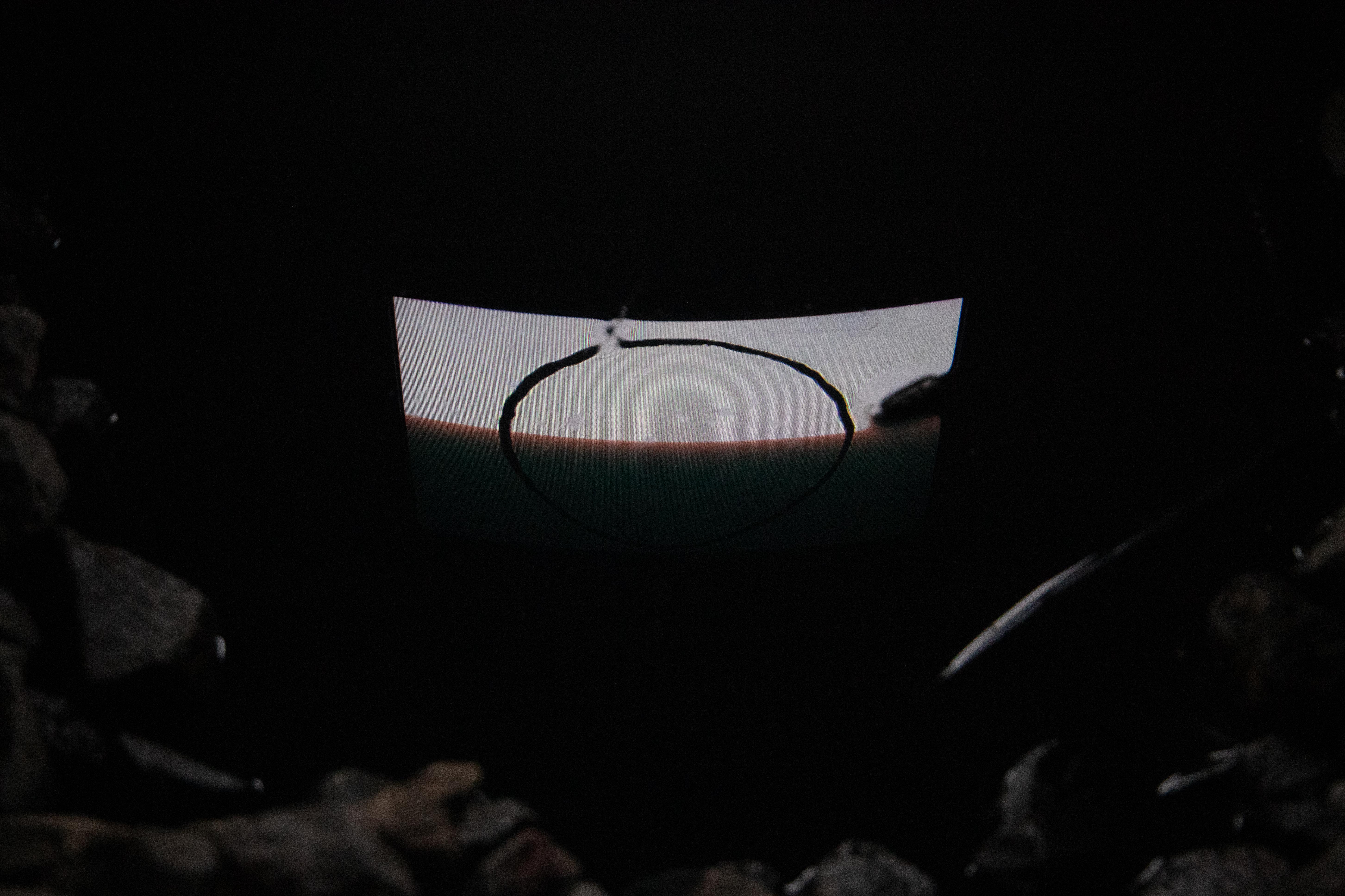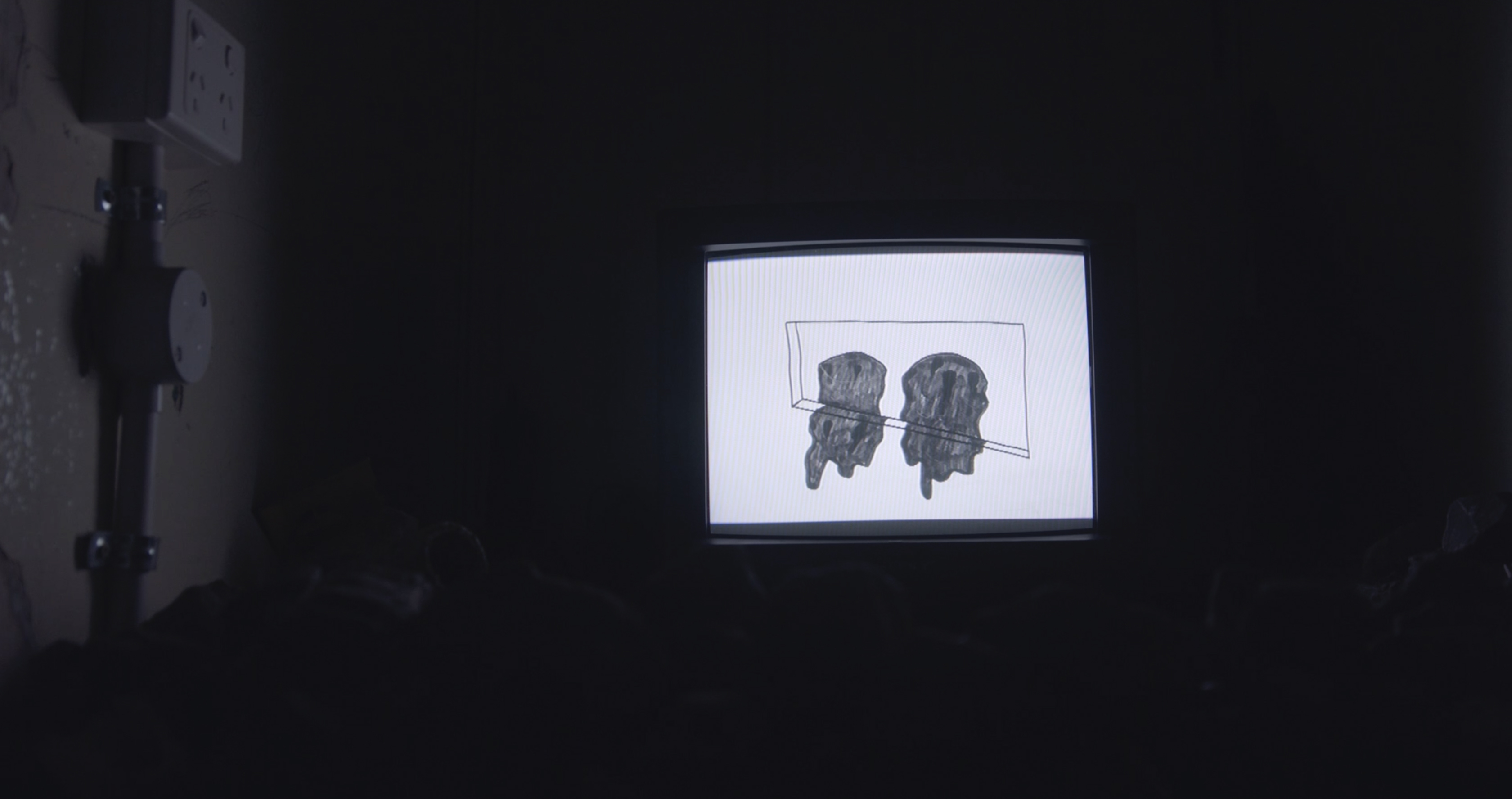 Hamish’s work ‘Birthing Pool’ was a video installation consisting of hand-drawn ink animations on paper. Tucked in a dank little spot in the hotel the animation is a series of disparate scenes such as three shrouded figures moving towards the viewer, a pair of eyes appearing at a slot which then drip black matter through, a hand being crushed by rotating machine parts and a figure tumbling down a set of stairs. Hamish uses Lousy Ink, a 100% recycled ink sourced from upcycled inkjet printer cartridges.
