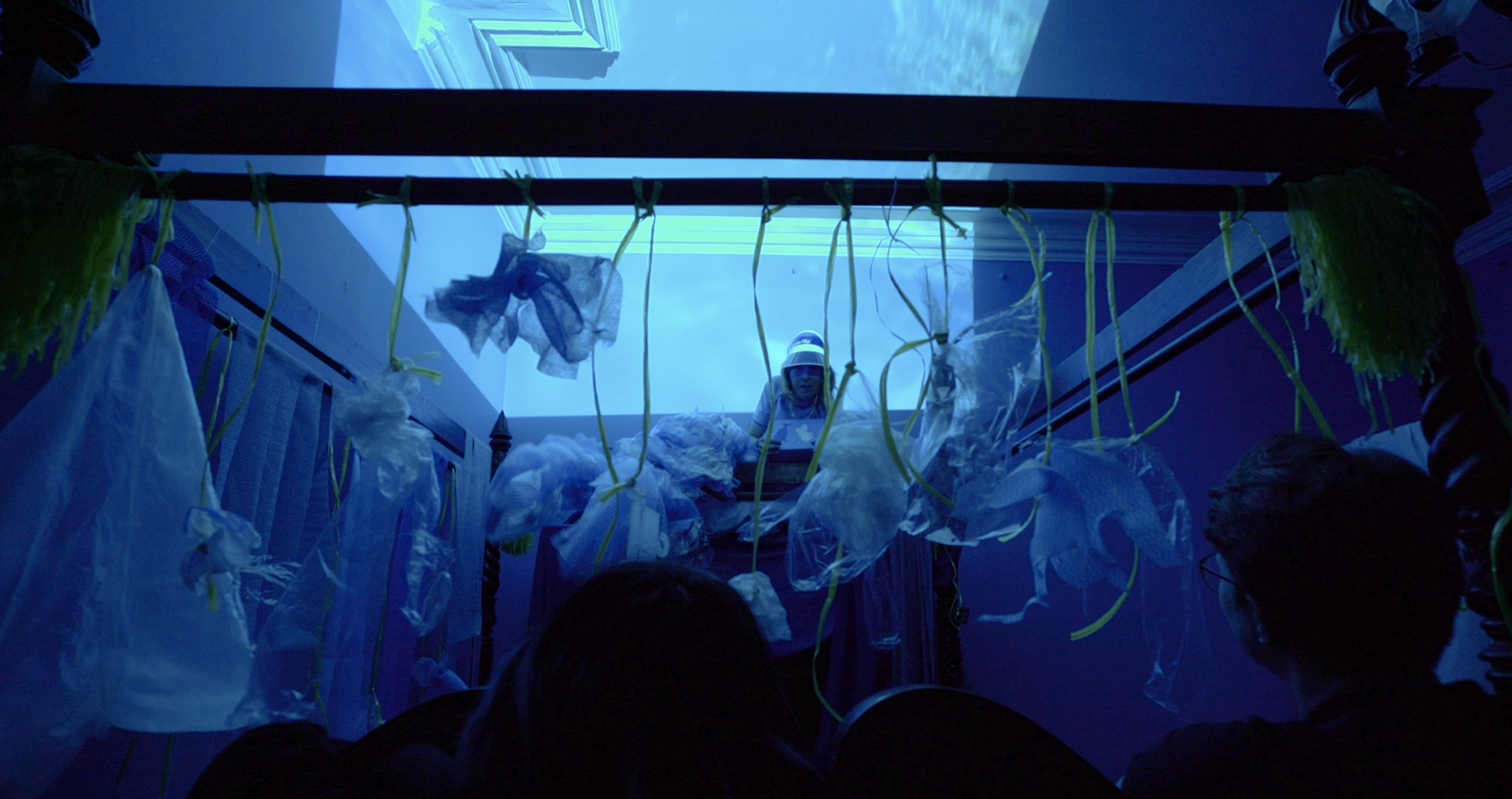 Nico created and performed a new site specific work for Supernaculum: “I was inspired by the idea of the "last drop" and wanted to create a water-inspired, immersive work using projection and performance. The audience is "submerged" into an imaginary underwater world of blue light and watery visuals while you are read ‘bedtime’ stories by a ‘trash to treasure’ mermaid. The idea of drowning in an underwater world reflects the real danger faced by rising sea levels due to climate change.” Nico used the hotel’s original four poster bed and furniture from the Purple room as part of her installation.