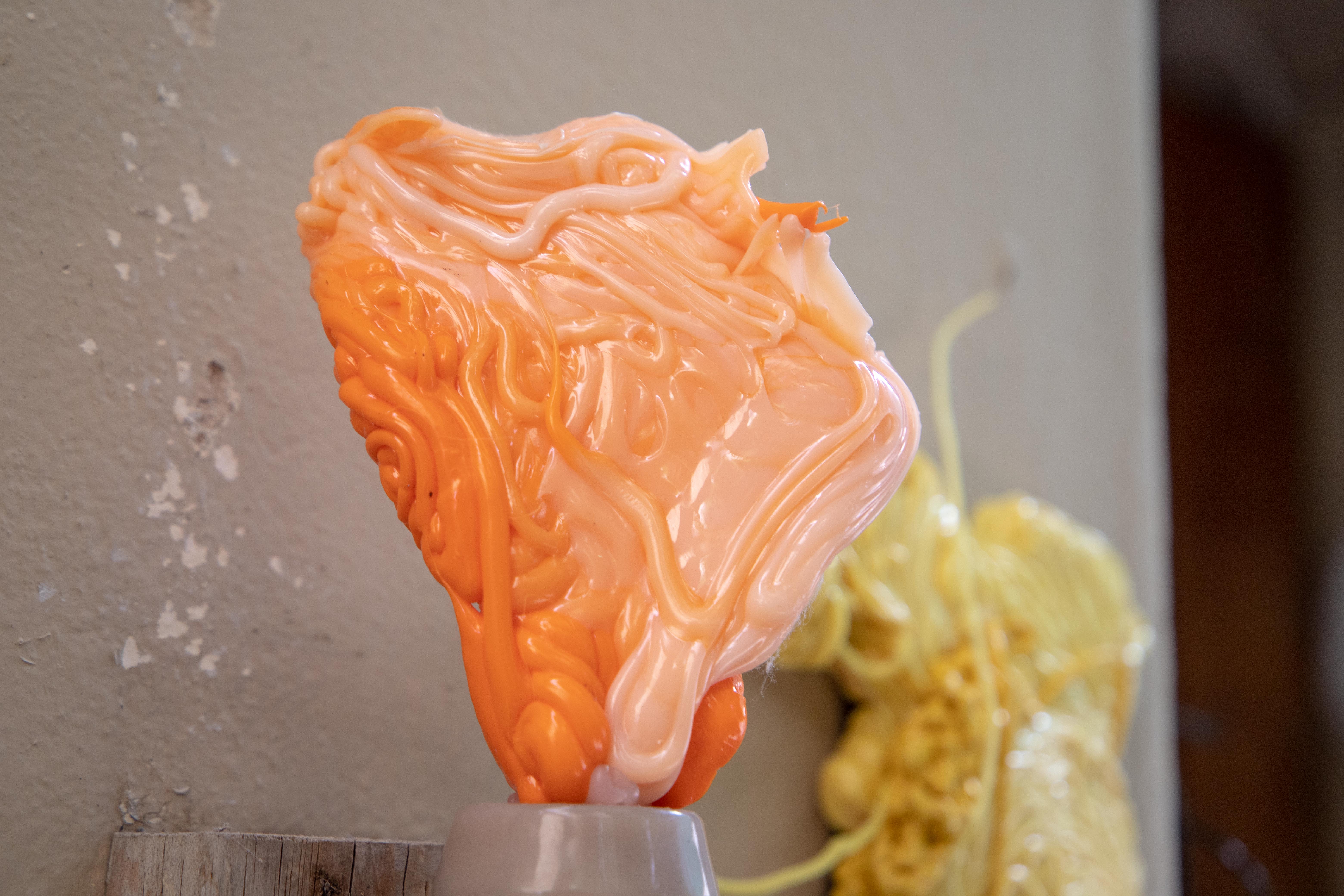 Warwick Perrin’s ‘Splats’ debuted at Supernaculum. His 3D printing practice led him to discover these industrial plastic waste products from an injection moulding plant. He collected the most peculiar and fascinating examples and created an installation with these viscous but solidified plastic forms. “I looked at the failures, accidents and what is thought of as waste; the changing colours and the degree of heat in a plastic extruding machine can produce an aesthetic creation out of purged plastic waste. The results are formed by squeezing the last remaining colour out of the machine until the new colour is ready.”